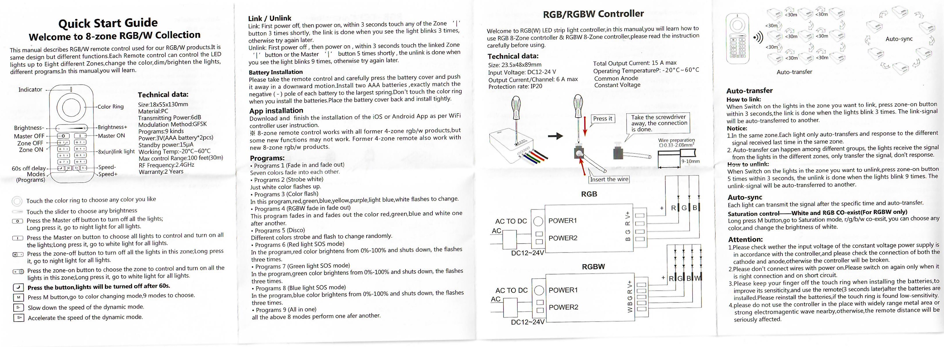 Note this product needs to be accompanied with an 8 Zone Controller Remote. This remote allows you to choose between 8 different zones, and can be used with RGB or RGBW controllers, or a mix of both! It can turn them on and off, change and dim the LEDs in each zone independently. You will need at least one controller for each zone you wish to run, but one remote will operate them all. Please see 8 Zone Controller Remote for more details on the remote's functionality.