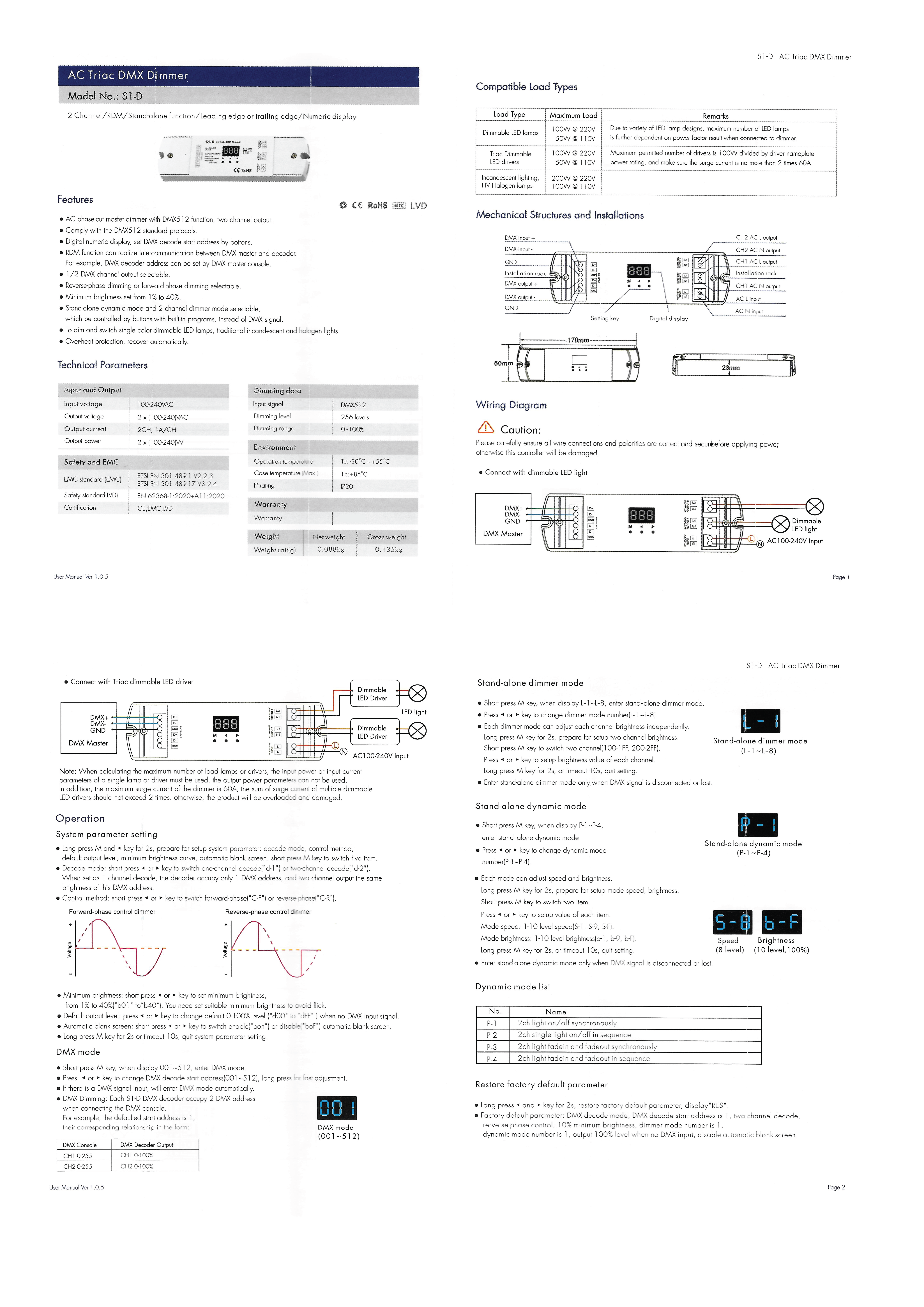 It has forward-phase (leading edge) dimming or reverse-phase (trailing edge) dimming as optional, and the minimum brightness level can be set between 1 and 40%.